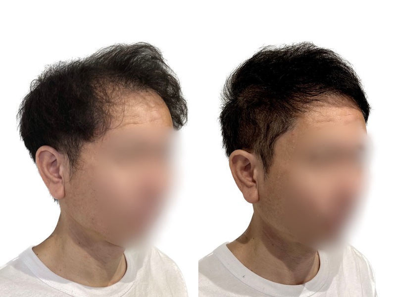 前頭部と頭頂部の両方に広範囲でAGAの影響が出ています。くせ毛のせいで両サイドのボリュームが多く、頭頂部はさらに少ないように見えてしまいます。 両サイドはあえて刈り上げず、セットで潰せる長さを残しています。上はボリュームの出し易いくせ毛を活かして長さを残し、厚みと高さでカバーしました。くせ毛は髪型次第でメリットにもデメリットにもなります。