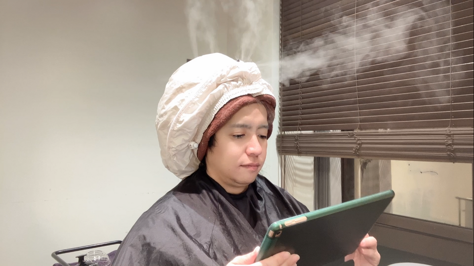 ブラッシング後は、温かいミストで5分間温めて毛穴を開かせます。