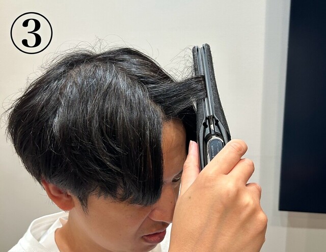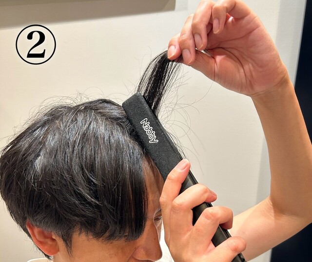 ②根元から垂直にアイロンを入れて根元を立ち上げる。